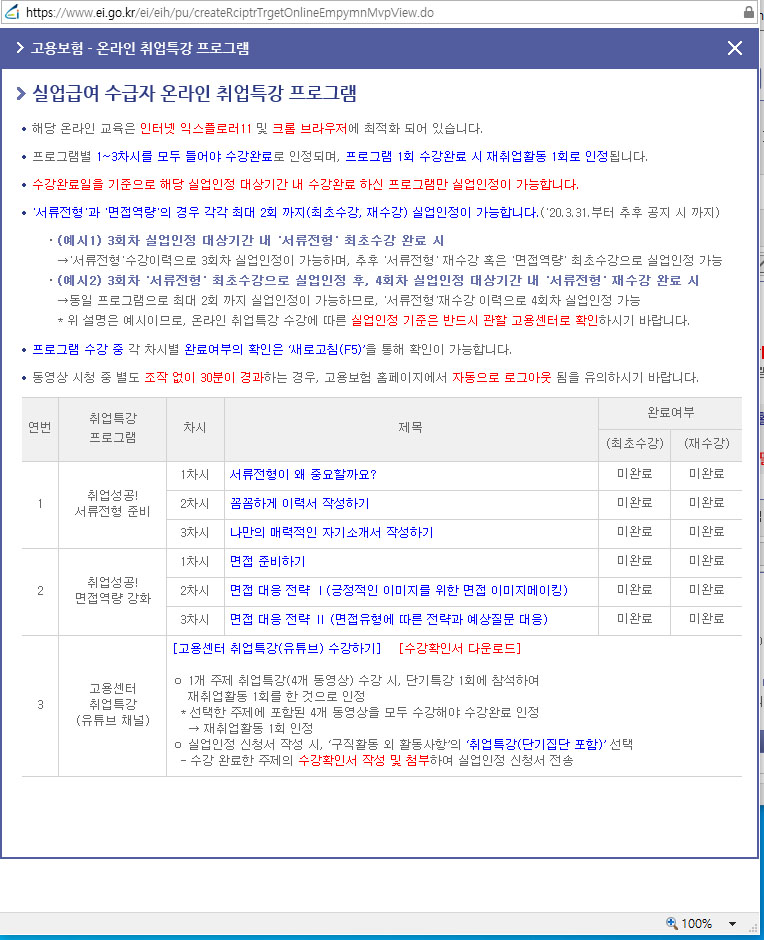 코로나때문에 유튜브동영상 시청만으로도 모든 회차 구직활동이 커버된다고 하네요.